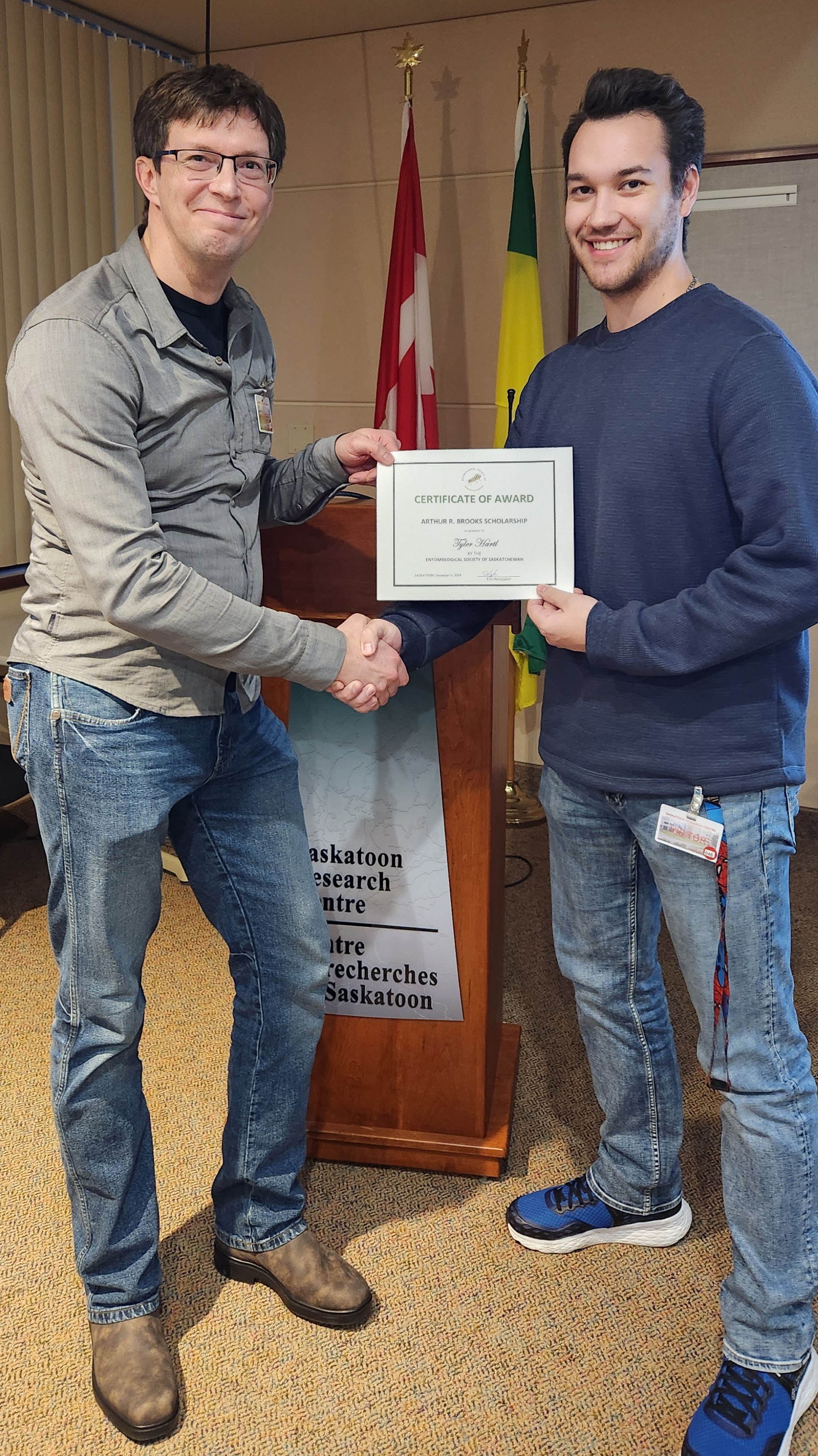 2024: Congratulations to Tyler Hartl, M.Sc. candidate at the University of Saskatchewan. His research focuses on developing species distribution models to predict pea aphid habitat suitability and migration under climate change, an insect vector of pea seed borne mosaic virus.